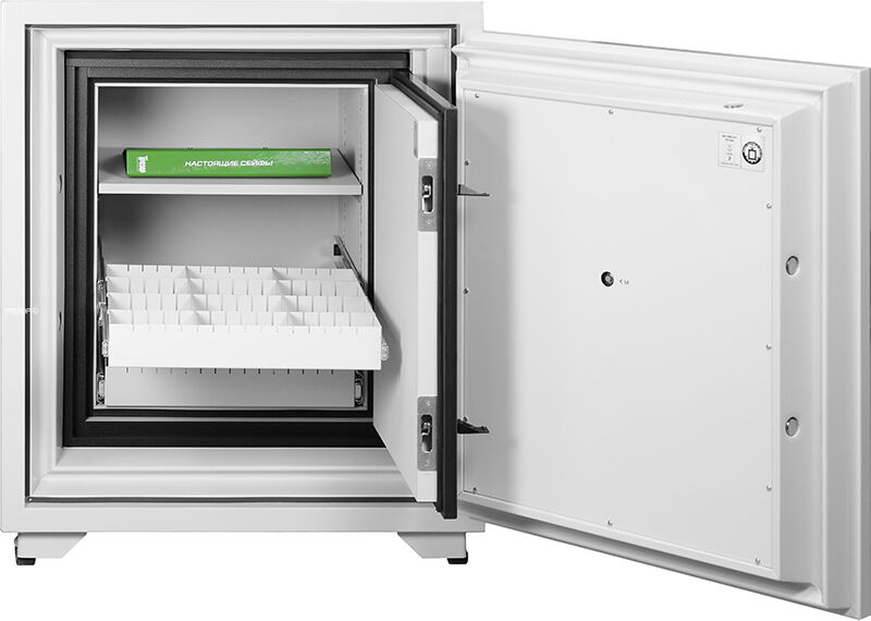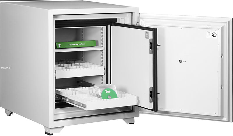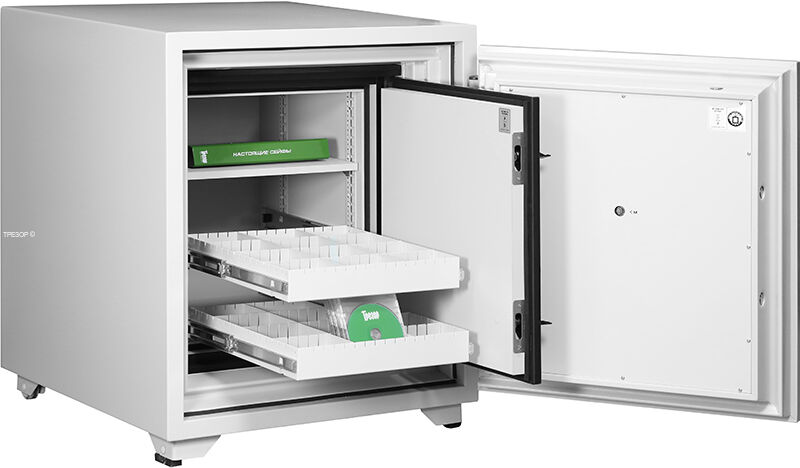 В базовом исполнении модель оснащается 2 универсальными выдвигающимися ящиками и одной полкой. Сейф может быть заказан пустым, без ящиков и полок - индекс этой модификации - DE. Вмещает (по информации производителя) до 580 DAT или 282 CD или 171 LTO. Рекомендуем купить для хранения резервных копий данных с серверов небольшого предприятия. Пустая или с оснащённая только полками версия отлично подойдёт для хранения неформатных информационных материалов типа рентгенограмм или томограмм, фото и кино плёнок.
