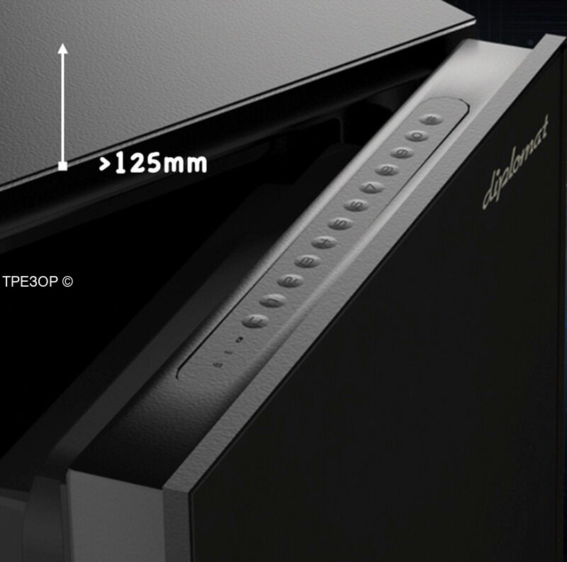 Особенностью модели является декоративная передняя панель с находящейся в верхнем торце двери клавиатурой электронного замка. Комплектация предусматривает переставляемую по высоте полку, выдвигаемый пластиковый контейнер для мелких предметов, внутреннюю LED подсветку, сигнализацию 110dB, моторизованный замок, встроенный батарейный отсек (выдвигается вправо на 125 мм), крепление к полу/столешнице и многие другие продуманные решения.