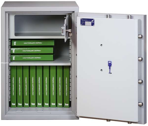 Заводской интерьер продуман и универсален: запираемый внутренний сейф оборудован сувальдным ключевым замком, полки переставляются по высоте и способны выдержать хранение слитков и пр.